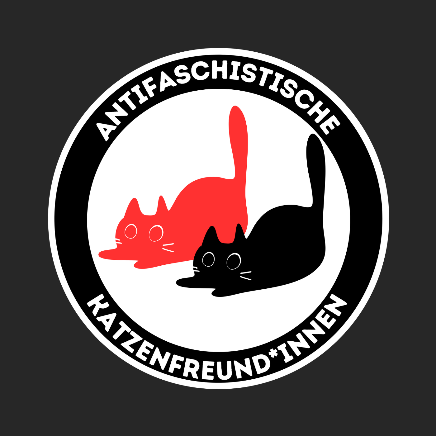 Zwei aufmerksame Katzen statt wehender Fahnen - das Motiv von Klara ist eine liebevolle, subversive Hommage an das klassische Antifa-Logo. Es verbindet politische Haltung mit Katzenliebe und zeigt, dass Widerstand auch leise, schnurrend und mit Krallen sein kann. Wer Katzenfreund*in ist, kann kein Faschist sein.