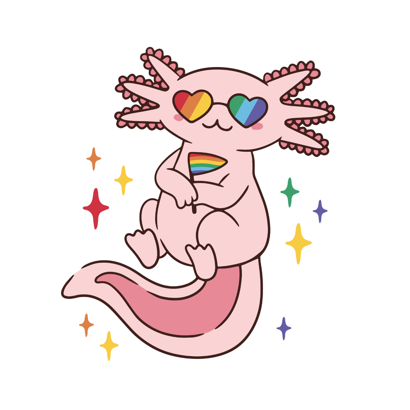 Das Axolotl mit Regenbogenbrille, Pride-Flagge und bunten Sternchen feiert Vielfalt, Liebe und Selbstbewusstsein (Pride = Stolz). Es macht queere Sichtbarkeit fröhlich, weich und unübersehbar - im Alltag, auf dem CSD oder als Geschenk, das Community stärkt.