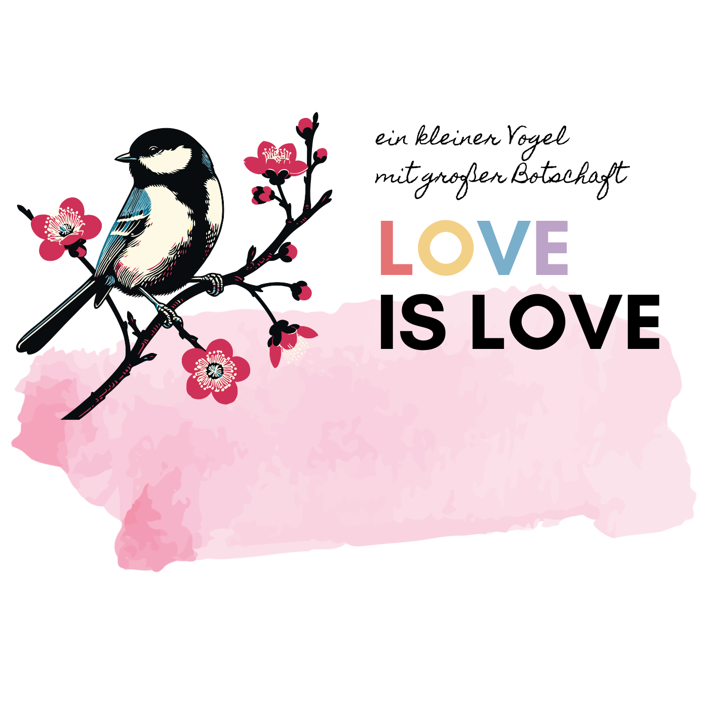 Kleine Flügel, große Botschaft - Love is Love (Liebe ist Liebe). Das Motiv feiert queere Liebe in all ihren Formen, macht Vielfalt sichtbar und stärkt Solidarität. Trage es mit Stolz - für eine Welt, in der jede Liebe zählt.