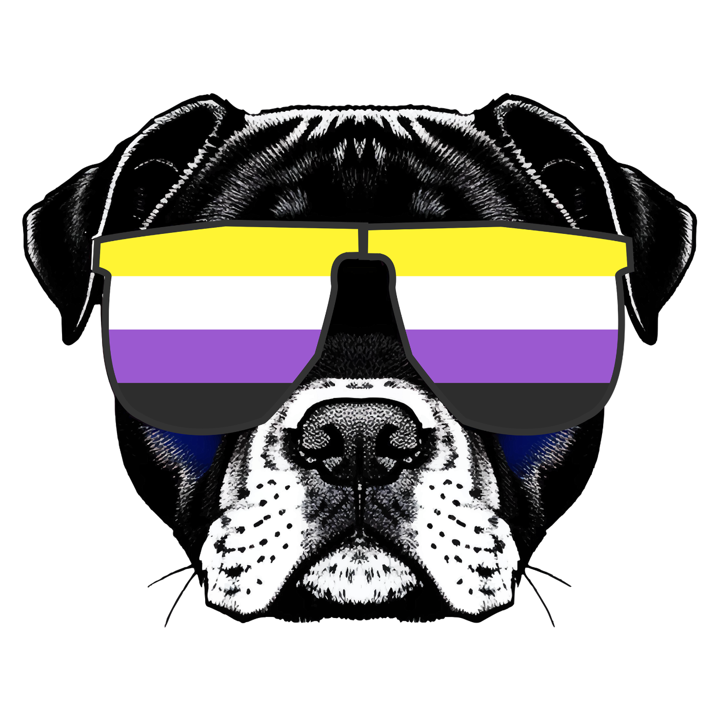 Der Nonbinary Doggo trägt die Nonbinary-Flagge auf der Sonnenbrille und sagt: Sichtbarkeit ist normal. Das Motiv verbindet Hundefreude mit queerem Empowerment (Selbstermächtigung) und macht klar: Nonbinary-Identitäten gehören selbstverständlich dazu - auf der Straße, im Job, überall.